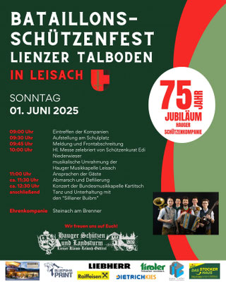 Sonntag 1. Juni 2025 | A-9909 Leisach | Bataillonsschützenfest | ab 12:00 Uhr |